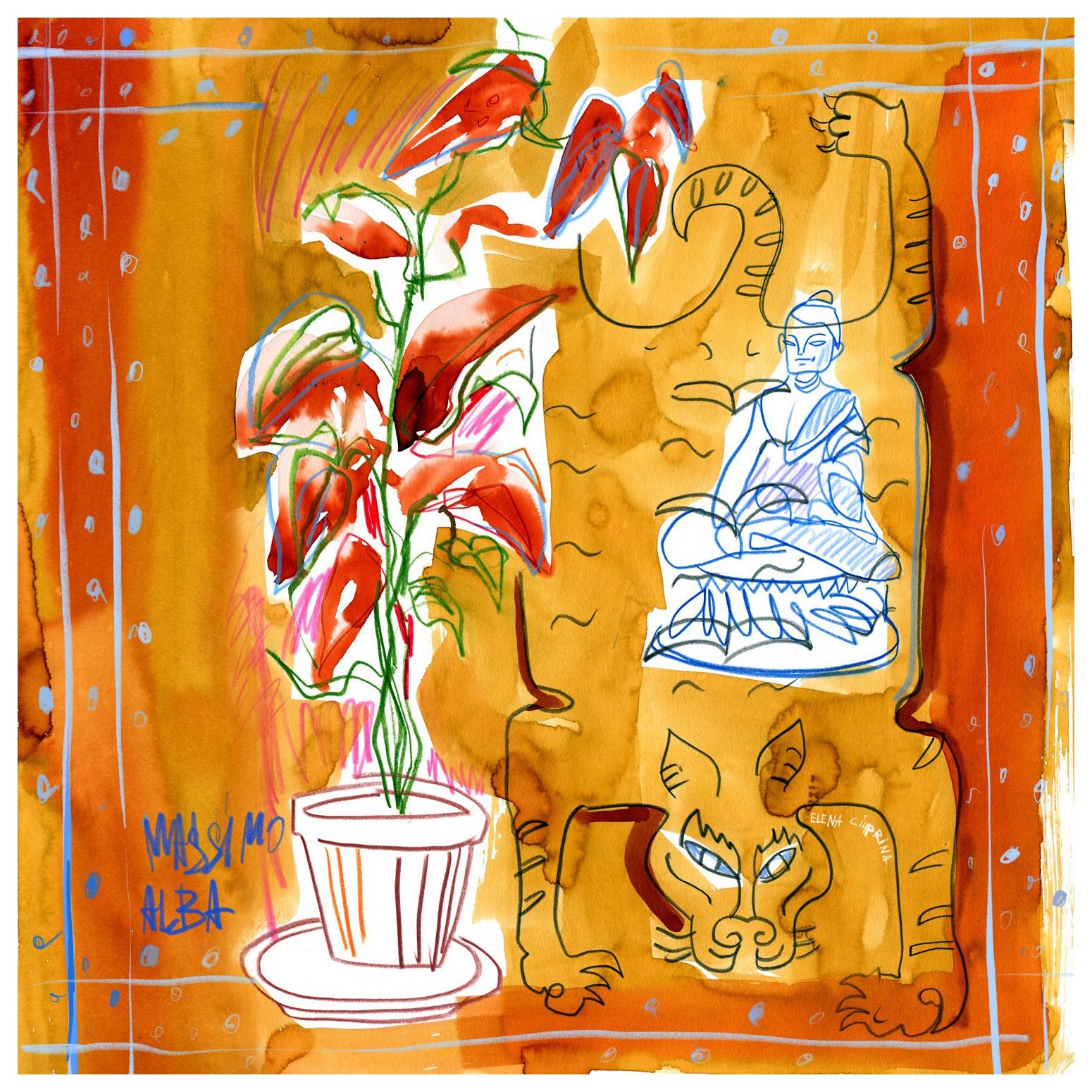 For the Spring / Summer 2022 season, Elena Ciuprina collaborated with Massimo Alba and created artworks for a set of six handkerchiefs. The collection holds the name of “References". The title alludes to the subjects depicted within each one of the illustrations. These all show parts of the Milanese home of the Creative Director, characterized by the presence of design objects, souvenirs from travel around the world and flowers of all kinds.